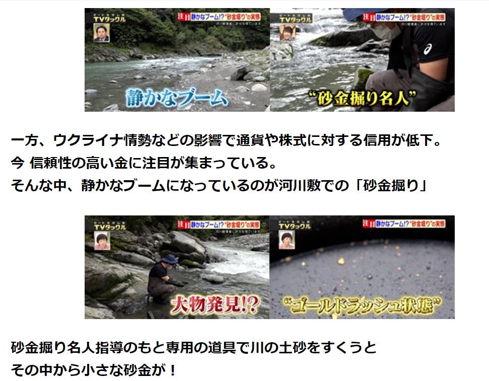| 東京MXTV | 2022年5月7日 砂金採りのインストラクターとして、藤間桜(天城サリー)さんとほしのディスコさんの砂金採りに協力します。 |